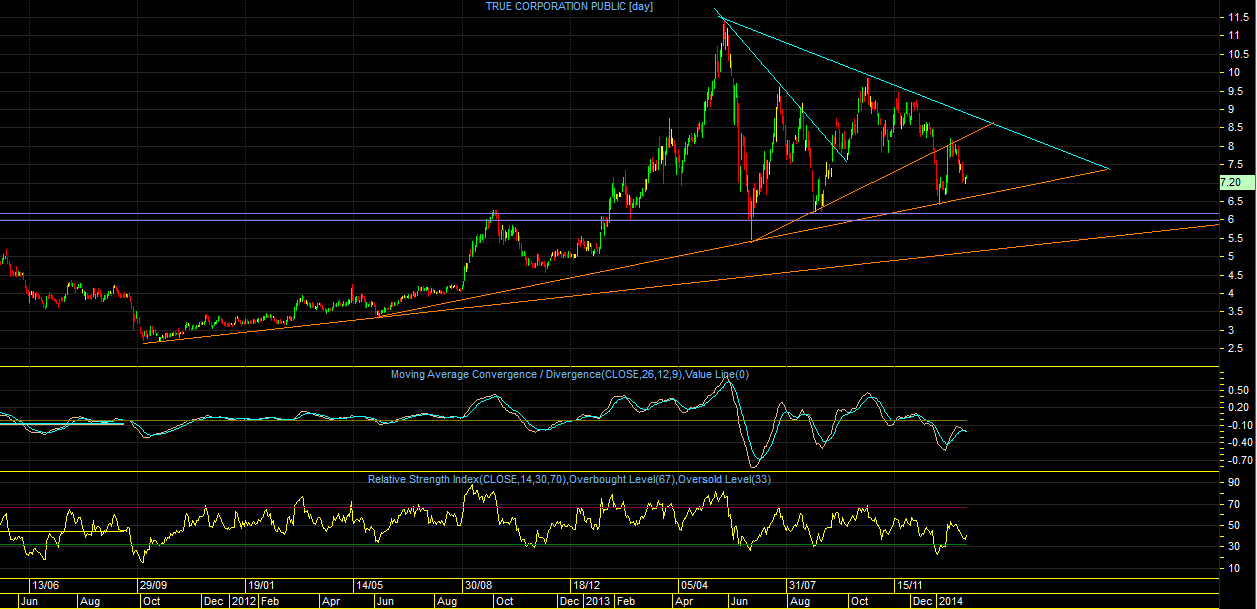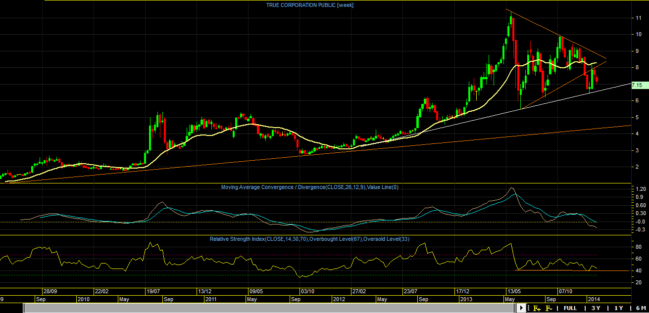 เลยต้องมาอยู่แนวรับบริเวณเส้นสีขาว ดูจาก momentum ทั้ง RSI MACD ผมว่ามีความเสียงที่จะลงสู่บริวเวณ 5 บาท +/-
