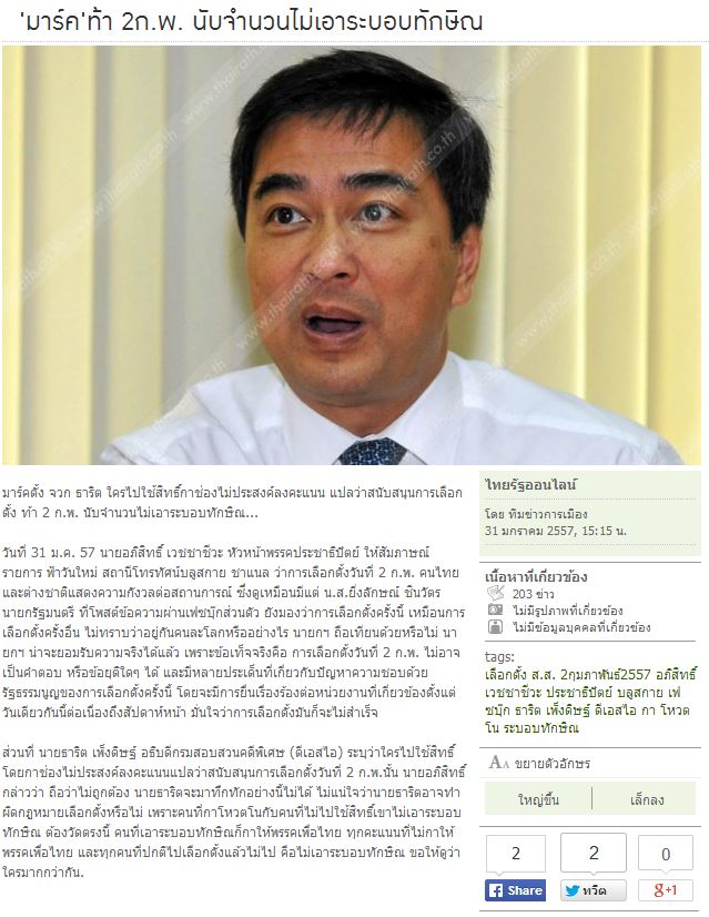 'มาร์ค'ท้า 2ก.พ. นับจำนวนไม่เอาระบอบทักษิณ