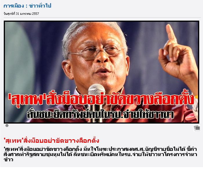 'สุเทพ'สั่งม็อบอย่าขัดขวางลือกตั้ง มั่นใจโมฆะประกาศผลส.ส.บัญชีรายชื่อไม่ได้ ชี้คำสั่งศาลทำรัฐสลายชุมนุมไม่ได้ ลั่นชนะยึดทรัพย์คนในรบ.จ่ายให้ชาวนาโครงการจำนาข้าว