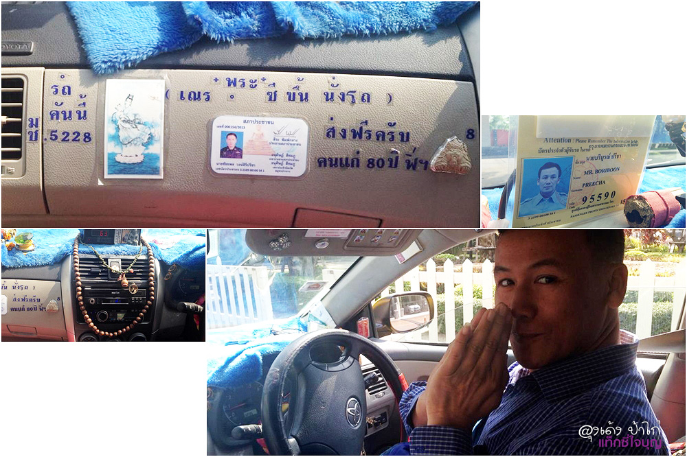 เพลงธรรมะ เบาๆ จากเครื่องเสียงในแท็กซี่ ภายในรถก็มีรูปพระ ติดตามหน้ารถ เพดานรถ