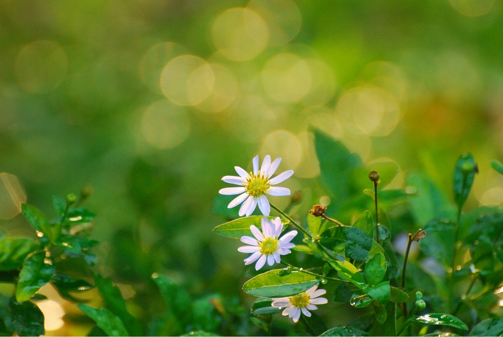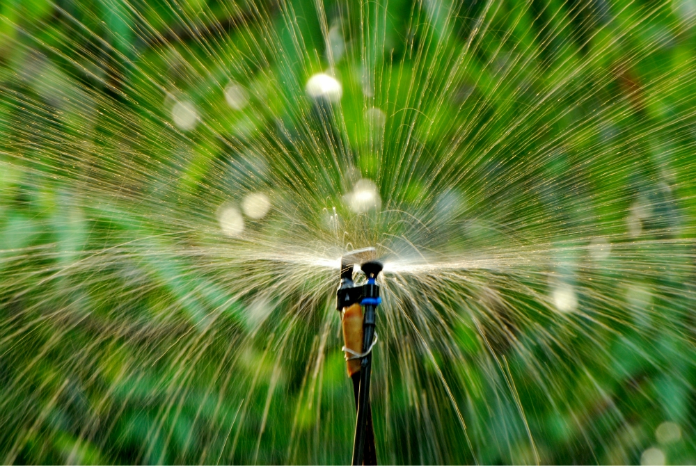 นั่งมองน้ำจากสปริงเกิลในสวน สะท้อนกับแดดตอนเย็น