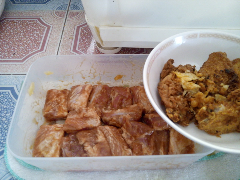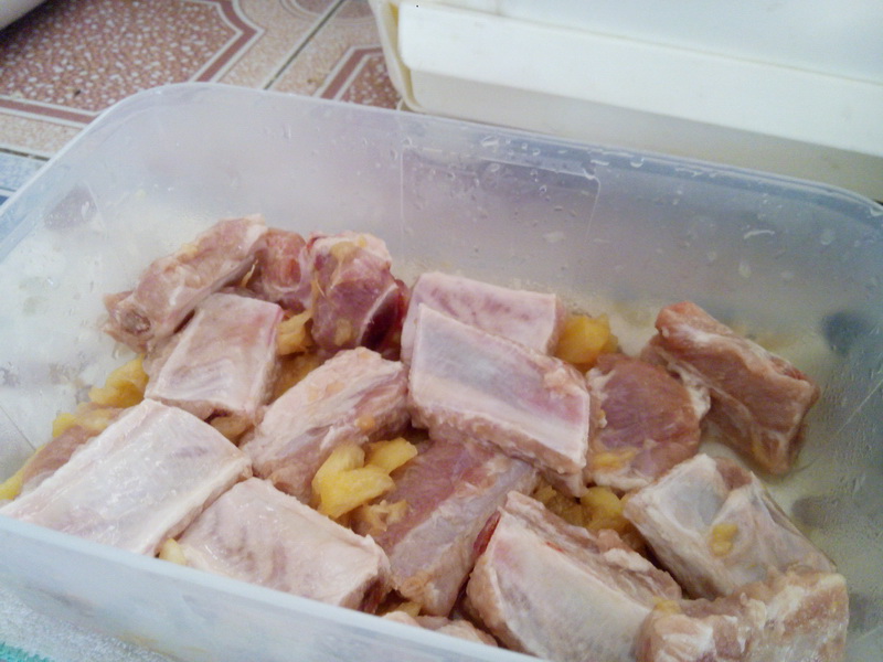 3. กลับมาดูซี่โครงเราดีกว่า เอาสับปะรดที่หมักไว้ออกซะ