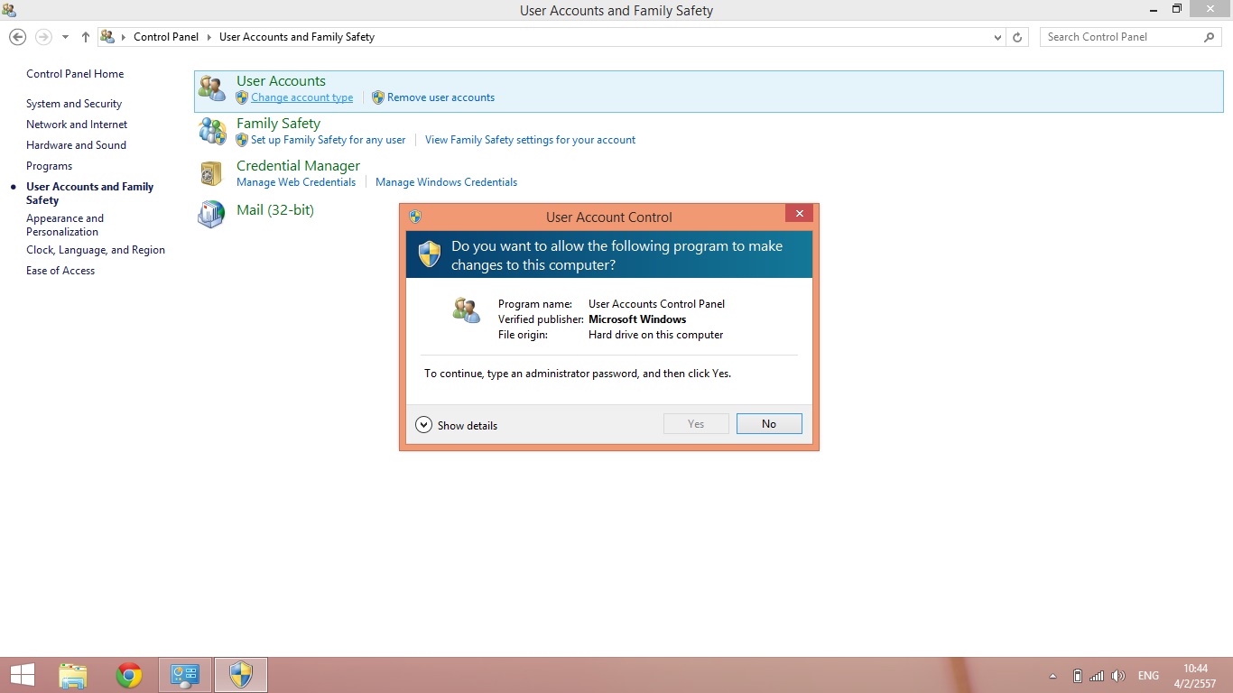 คือ ผมไปปิด account ที่มันเป็น admisnistrator อ่ะ เพราะเวลามีปัญหาขี้เกียจเปลี่ยนไปเปลี่ยนมา ผมใช้วิธี command prompt(admin) แล้วใส่ net user อะไรสักอย่าง restart เครื่องมาใหม่เข้าโปรแกรมแล้วมันยังถาม