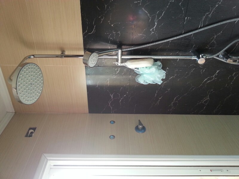 ที่ห้องน้ำเดินท่อสำหรับ ระบบน้ำร้อนไว้ในผนัง ตามระบบแล้ว แต่ก่อนยังไม่ติดเครื่องทำน้ำร้อน ใช้น้ำเย็นผ่านวาล์วฝักบัวเป็นพวงมาลัย ธรรมดา ออกจากฝักบัวแรงปกติ(น้ำออกจากรูปฝักบัว เป็นเส้นชัดเจน) ตามรูปด้าน