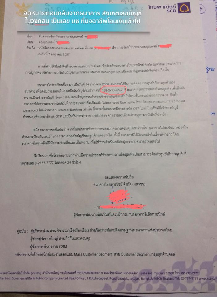 เป็นโชคดีของผมที่ได้ติดตามกระทู้และข่าวคราวในเวปพันทิพย์ เกี่ยวกับที่ถูกโจรกรรมเงินไปบัญชีไปด้วยวิธีโอนผ่าน internet bank ซึ่งเรื่องราวที่เกิดขึ้นเหมือนกรณีที่ผมเจอเป๊ะเลย และยังเป็นธนาคารไทยพาณิชย์และศูนย์เทเลวิชหมือนกันอีกด้วย จึงได้ขอคำปรึกษากับทาง คุณรังสรรค์ คอยให้คำปรึกษาและให้กำลังใจ พี่เค้าได้แนะนำให้ส่งจดหมายร้องเรียนไปยังธนาคารแห่งประเทศไทย ผมเลยได้ส่งจดหมายร้องเรียนเข้าไปทางเวปไซต์ และได้เข้าไปพบเจ้าหน้าที่ฝ่ายตรวจสอบเรื่องร้องเรียนของธนาคารแห่งประเทศไทย สาขา เชียงใหม่ ทางเจ้าหน้าที่ก็ได้ดำเนินเรื่องตามขั้นตอนให้ ตัวผมเองก็คิดว่ายังไงทางธนาคารไทยพาณิชย์ต้องรับผิดชอบแน่นอน เพราะผมเองก็ได้แสดงความบริสุทธิ์ใจว่าผมไม่มีส่วนเกี่ยวข้องกับเรื่องนี้ด้วยหลักฐานที่ชัดเจน ผมส่งเรื่องให้กับทางแบงค์ชาติในวันที่ 2มกราคม 2557 และทางธนาคารไทยพานิชย์ได้ส่งจดหมายชี้แจงกลับมา ลงวันที่ 14 มกราคม 2557 แต่ผมเพิ่งได้รับจดหมายเมื่อวันที่ 28 มกราคม 2557เนื่องจากผมไม่อยู่บ้านโดยทางธนาคารได้แจ้งว่า " เมื่อวันที่ 24 ธันวาคม 2556 ธนาคารได้รับการติดต่อผ่านศูนย์บริการลูกค้าของธนาคารเพื่อสอบถามยอดเงินคงเหลือในบัญชีเงินฝาก เลขที่ 159-2-13955-7 ซึ่งทางธนาคารได้ตรวจสอบตัวตนลูกค้าเพื่อยืนยันความเป็นเจ้าของบัญชีโดยการสอบถามข้อมูลส่วนตัวของเจ้าของบัญชีนั้นเป็นไปตามขั้นตอนปกติของธนาคาร อีกทั้งยังได้จรวจสอบไฟล์บันทึกการสนทนาเพิ่มเติมแล้ว ไม่พบการขอ user name ใหม่ " ซึ่งเลขที่บัญชี 159-2-13955-7 เป็นเลขที่บัญชีที่มิชฉาชีพได้ทำการโอนเงินจากบัญชีของผมไปยังเลขที่บัญชีนี้ ไม่ใช่เลขที่บัญชีที่ได้รับความเสียหายของผม เลขที่บัญชีของผมคือ830-xxxxxx-2 สรุป คือแบงค์เค้าไม่ได้สนใจความเสียหายของลูกค้าเลย เค้าเข้าใจเรื่องที่ผมร้องทุกข์ผ่านแบงค์ชาติไปมั้ย หรือได้อ่านจดหมายร้องเรียนอย่างชัดเจนรึปล่าว ถึงได้ตอบไม่ตรงคำถาม ทั้งๆที่จดหมายก็อธิบายอย่างละเอียดชัดเจน หลักฐานก็ส่งให้ครบถ้วน เค้ารับเรื่องและดำเนินการตรวจสอบอย่างไร ถึงได้ไปตรวจสอบเลขที่บัญชีของมิจฉาชีพ แต่ไม่ตรวจสอบบัญชีของเจ้าทุกข์อย่างผม และวันที่ 28 มกราคม 2557 ผมได้เข้าไปติดต่อกับธนาคารไทยพาณิชย์สาขาที่ผมเปิดบัญชีไว้ ทางสาขายังไม่รู้เรื่องเกี่ยวกับเรื่องที่เกิดขึ้นกับผมเลย ทั้งๆที่ผมได้แจ้งให้กับทางธนาคารไทยพาณิชย์ สำนักงานใหญ่ตั้งแต่วันที่ 25 ธันวาคม 2556 แค่นี้ก็แสดงให้เห็นแล้วว่า ธนาคารไทยพาณิชย์ไม่ให้ความสำคัญกับความเสียหายของลูกค้าเลย เพิกเฉยต่อการดำเนิ