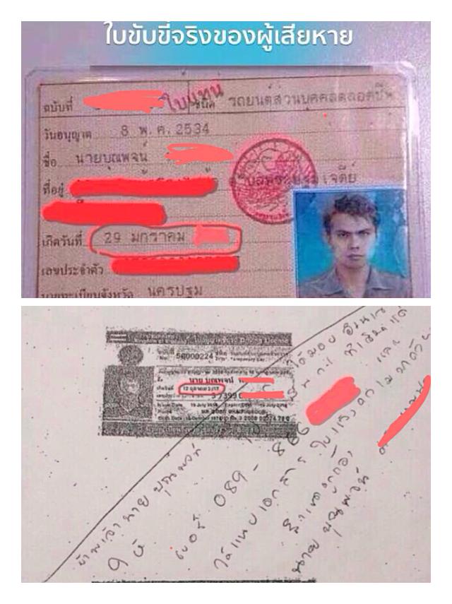 -ใบขับขี่รูปล่าง เป็นใบขับขี่ปลอมที่ทำขึ้นเพื่อเซ็นมอบอำนาจให้ไปเปิดซิมการ์ดใหม่ สังเกตที่วันเดือนปีเกิด ไม่ตรงกับของผู้เสียหาย