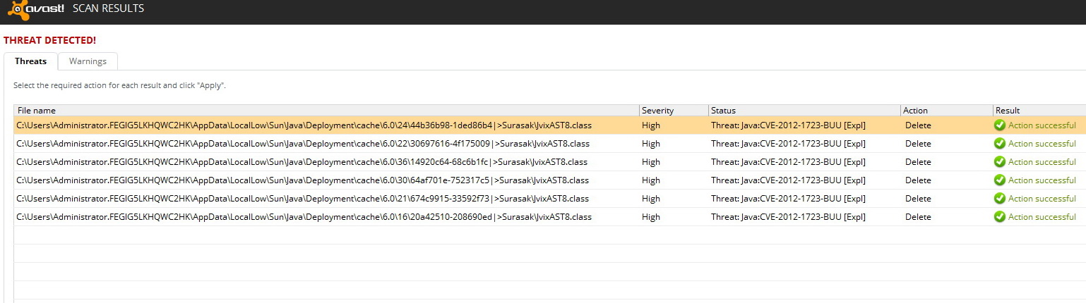 ผมลง avast สองเครื่อง อีกเครื่องหนึ่งไม่ลบ java แต่อีกเครื่องหนึ่งลบทุกครั้งที่สแกนเจอ