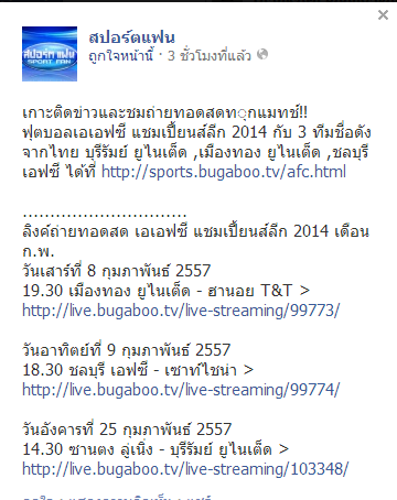 ถ่ายทอดสดฟุตบอลเอเอฟซี แชมเปี้ยนส์ลีก 2014 อีกหนึ่งตัวแทนจากไทย ชลบุรี เอฟซี พบ เซาท์ไชน่า เวลา 18.30 น. ลิงค์ถ่ายทอดสด > http://live.bugaboo.tv/live-streaming/99774/ เครดิต เฟซบุ๊กสปอร์ตแฟน https