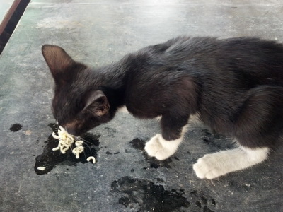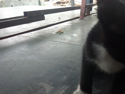 ขณะที่ผมกำลังบรรเลงเพลงครวญในการปรุงอาหารญี่ปุ่นอยู่นั้น มีวัตถุสีดำชนเข้าที่ขาผมอย่างจัง