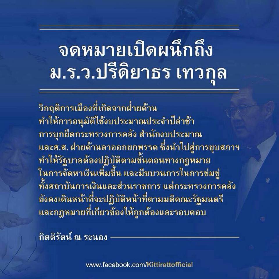 นายกิตติรัตน์ ณ ระนอง รองนายกฯ และ รมว.คลัง ได้โพสต์เฟซบุ๊คออกจดหมายเปิดผนึกถึง ม.ร.ว.ปรีดิยาธร