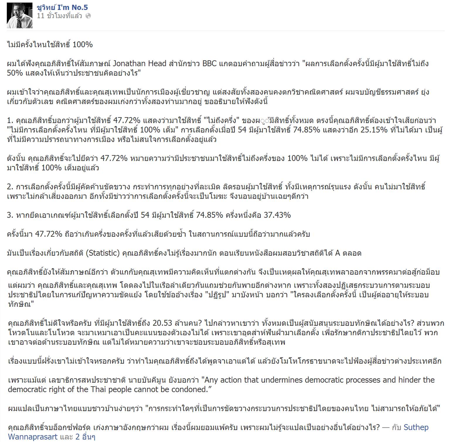 ที่มา http://www.matichon.co.th เฟซบุ๊ก "ชูวิทย์ I′m No.5" ของ นายชูวิทย์ กมลวิศิษฏ์ หัวหน้าพรรครักประเทศไทย โพสต์วิจารณ์การให้สัมภาษณ์ของนายอภิสิทธิ์ เวชชาชีวะ หัวหน้าพรรคประชาธิปัต