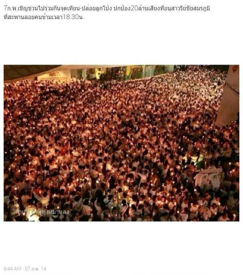 7 ก.พ. ช่วยกัน ปชส.เชิญชวนไปช่วยกันจุดเทียน-ปล่อยลูกโป่ง คืนพื้นที่ ปกป้อง 20 ล้านเสียง เพื่อ ปชต. ที่อนุสาวรีย์ชัยสมรภูมิ ที่สะพานลอยคนข้ามฝั่ง รพ.ราชวิถี มุ่งไป รพ.พระมงกุฎ เวลา 18.30 น. อย่าพลาด.....