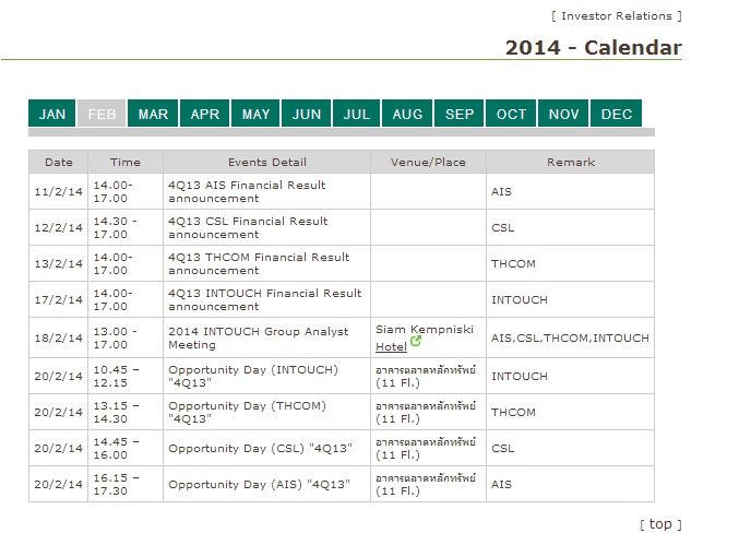 เดือนนี้ งบ Q4/2013 Intuch, Advanc , Thcom, Csl จะประกาศตามนี้ครับ