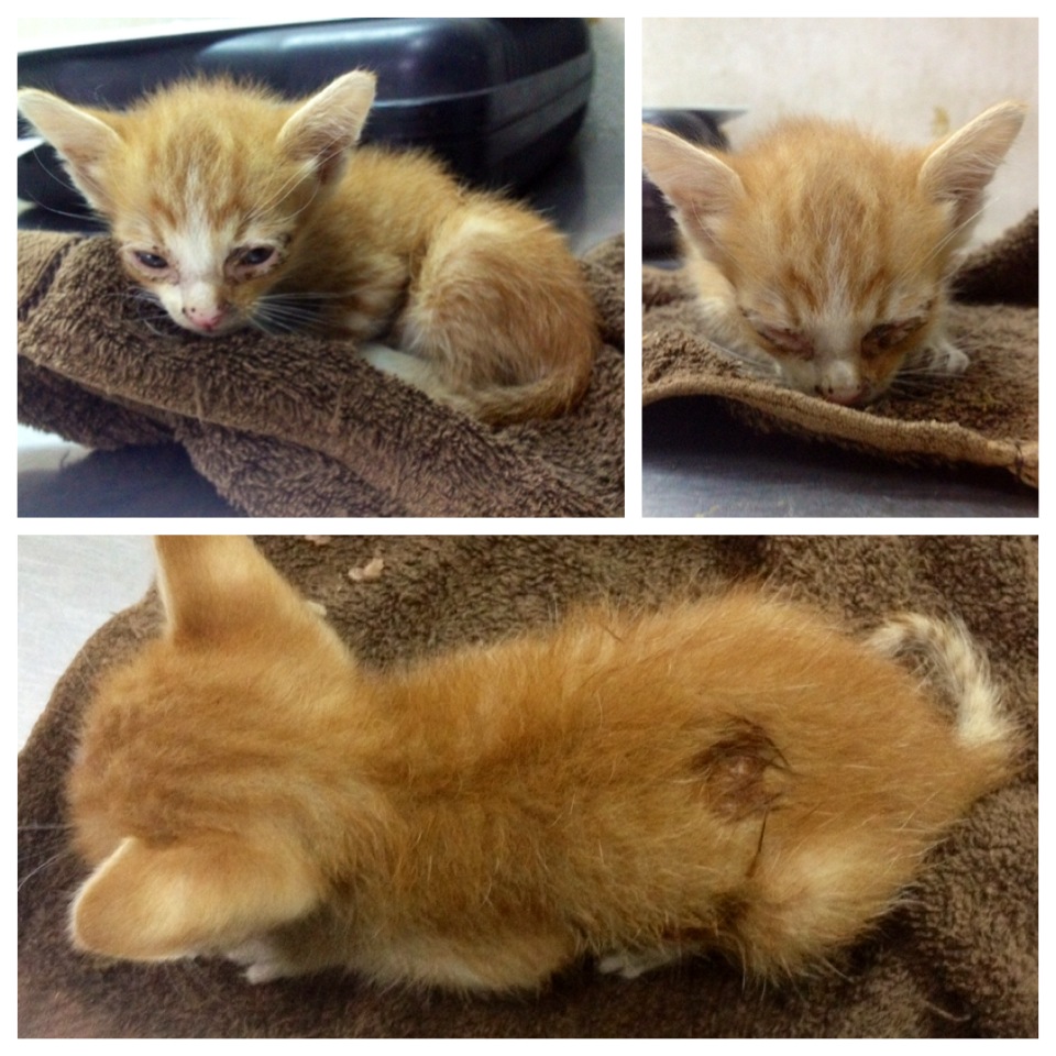 ไปงานศพเจอลูกแมวถูกหมาวัดกัดและลากมาจากไหนไม่รู้ช่วยน้องไว้ได้ทัน ความที่ไม่รู้จะทำไงดีเลยพาส่งคลินิค หมอบอกว่าน้องยังเด็กเกินที่จะวางยาสลบต้องคอยดูอาการไปก่อน 3 วัน น้องยังกินอาหารเองไม่ได้ ต้องคอยป้อนนมแพะที่หมอให้มา ผมต้องไปทำงานไม่มีเวลาป้อนนม ไม่แน่ใจว่าน้องจะพิการหรือเปล่า น้องเดินได้แต่ไม่สามารถใช้ขาหลังทั้งสองข้างแตะพื้น เดินใช้แต่สองขาหน้า น้องโดนกัด 3 ที่ ตรงน่องซ้ายและขวา 2 จุดและตรงสันหลังอีก 1 จุด หมอทายาให้อย่างเดียว คืนแรกผ่านไปด้วยดี สภาพที่พาน้องมาคลินิค