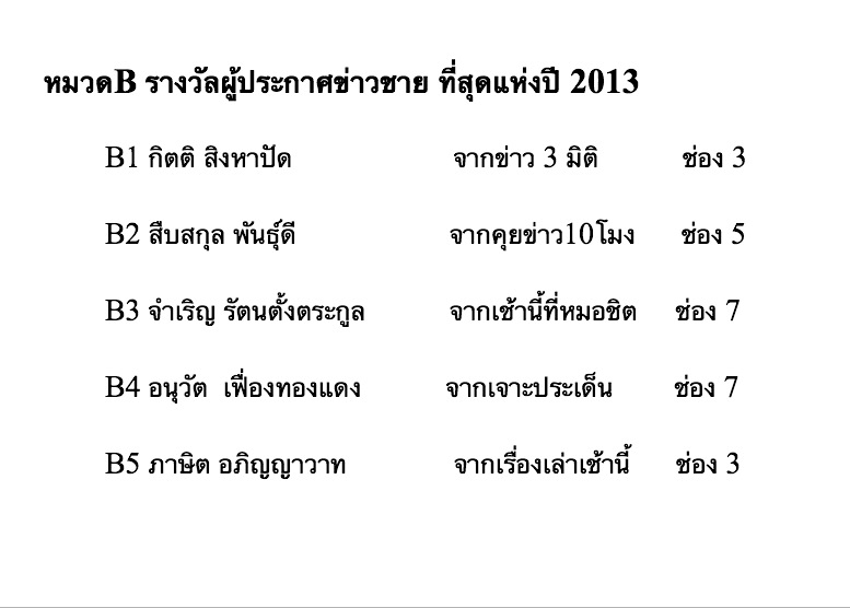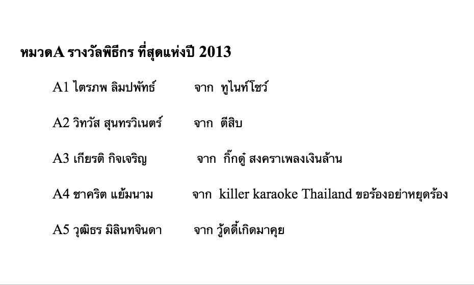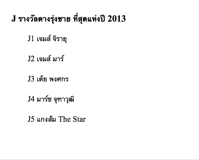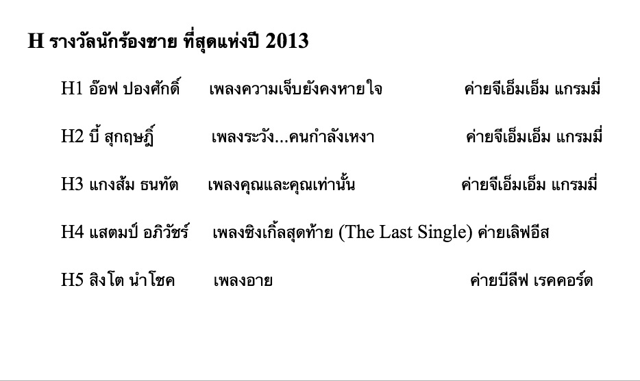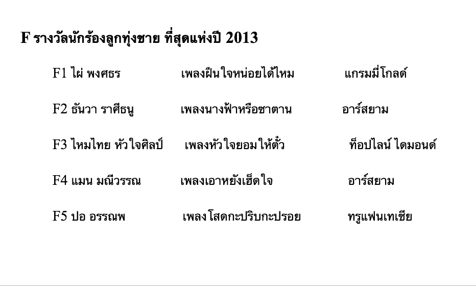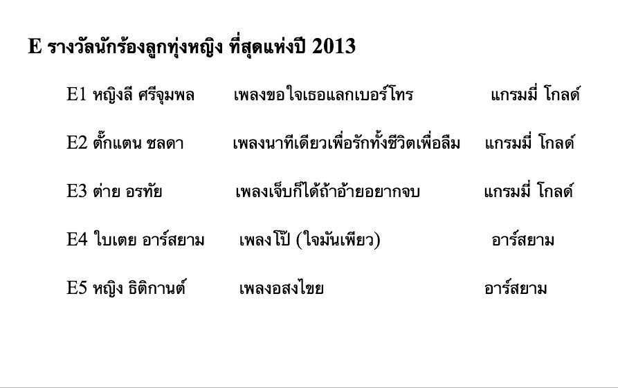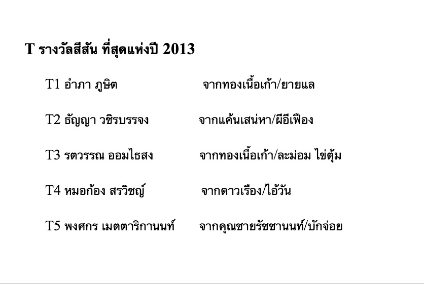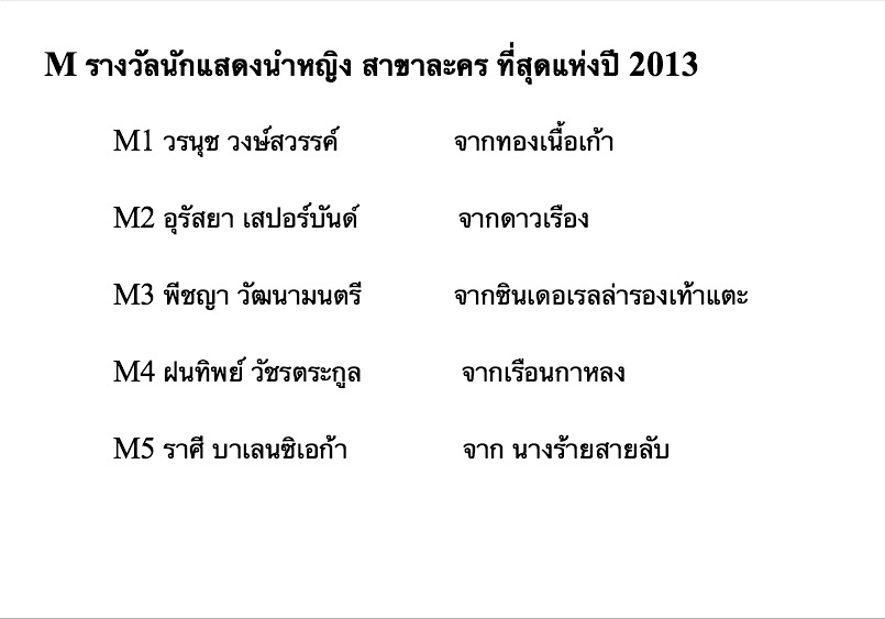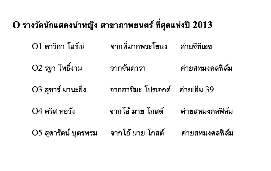 ก่อนอื่นงงค่ะ ถามผู้รู้ค่ะว่า ผู้ที่มีชื่อเข้าชิงมาจากการโหวตหรือกรรมการ ถ้าโหวตก็โอเคเข้าใจค่ะ แต่ถ้าไม่ใช่ งงกับรางวัล นำ ญ. และ นำ ช. ว่า พลอย, บี , นิว วงศกร ไม่ติดเหรอ อิอิ