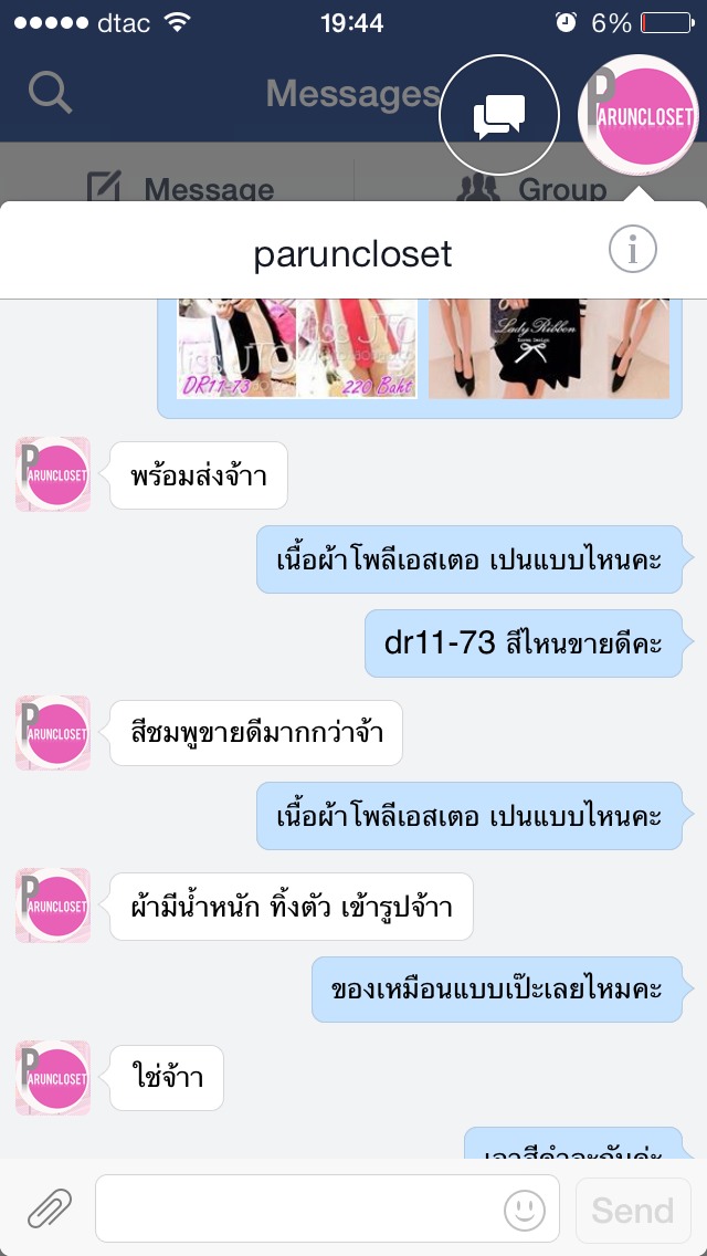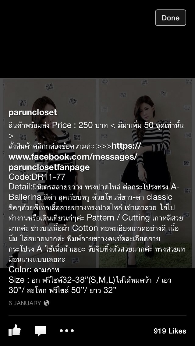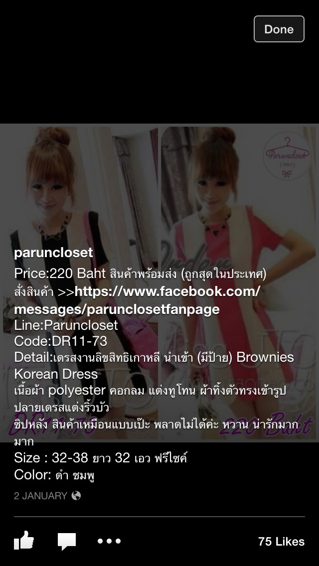 เราเห็นเพจขายเสื้อผ้า ขายปลีกในราคาส่งร้านหนึ่ง ยอดกดไลค์สูงเป็นหลักแสนค่ะ เสื้อผ้าที่ลงขายก็น่ารักทั้งนั้น และราคาก็น่ารักด้วย เราซึ่งเป็นคนชอบซื้อของทางเน็ตอยู่แล้ว ก็ถุกใจละสิคะ เลยสอบถามไปทางอินบล็อคเพจถึงตัวสินค้า ว่าเนื้อผ้าเป็นไง แม่ค้าบอกว่า เนื้อดี ผ้าสวย (ก่อนนี้เราเคยขอดูรูปสินค้าจริงทาง line ค่ะ แม่ค้าไม่ให้ดูค่ะ บอกว่า ไม่ได้ถ่ายไว้ พอบอกให้รบกวนถ่ายหน่อยก็หายไปเลยเราเลยไปทางเฟสบุคแทน) เราก็ถามย้ำแล้วว่า สินค้าเหมือนแบบใช่ไหม เค้าบอกเราว่าเหมือนแบบเป๊ะเลยค่ะ เราก็เชื่อเค้าเลยสั่งสินค้าร้านเค้ามาสองตัว ดังนี้