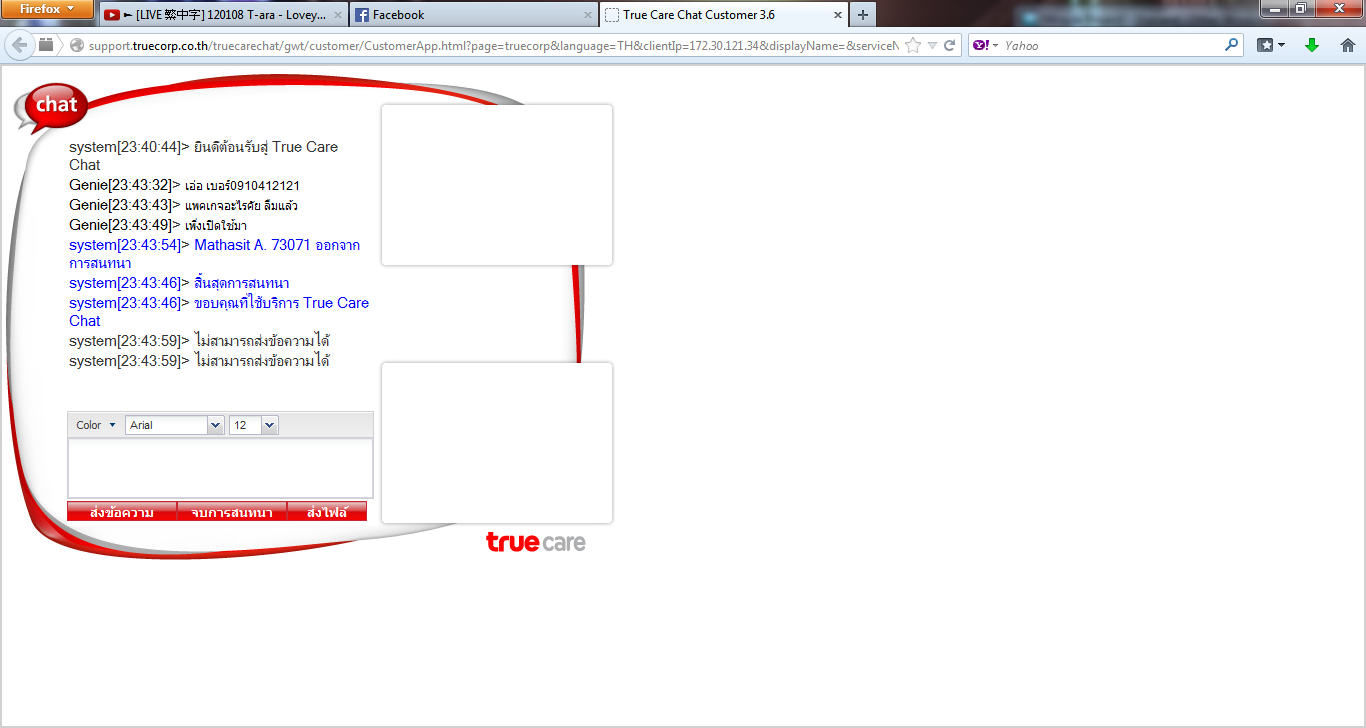 เรื่องเกิดสดๆ ร้อนๆมะกี้เลยค่ะ พี่ชายเราได้ทำการแชทคุยออนไลน์กับทางทรูเมื่อ 23.28 น. แต่ทางพนักงานให้รอ1คิว พี่เราก็รอค่ะ จนผ่านมา 23.40 น พนักงานได้ทำการทักทายคุยกับเรา แต่เราไม่ได้อยู่น่าเว็ปค่ะ คือรอนานมากก็เปิดเพลงไปเรื่อยๆ (ของทีอาร่า) จน 23.43 น เราได้มาทำการถามแทนพี่ชายว่า เบอร์ xxxxxx ใช้แพคเก็จอะไร ยังไม่ได้รับคำตอบเลยค่ะ กลับกลายเป็นว่าพนักงานออกจากแชทซะงั้นๆ ทั้งๆที่รอกันมาก็นาน 12นาที แต่พนักงานรอเราแค่ 3 นาที เห็นเราไม่ตอบ พนักงานเลยออกจากแชท ??? งงมากค่ะ โทรศัพท์ก็ซื้อศูนย์ทรูใช้แพคเก็จก็ของทรู (แต่ลืมแพคเก็จเลยมาสอบถาม)