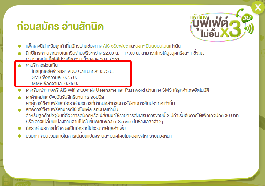 ตอนนี้ใช้แพ็กเกจบุฟเฟ่ต์ไม่อั้นx3 384 บาท ค่าบริการรายเดือน 384 บาท โทรฟรีในเครือข่ายAIS 22.00-17.00 น., Internet ไม่จำกัด(ความเร็วสูงสุด 384Kbps) และ AIS WiFi ไม่จำกัด ส่วนเกินโทร/VDO call นาทีละ 0.7