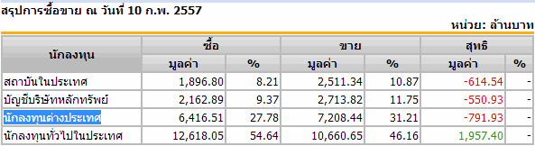 สรุปการซื้อขาย ณ วันที่ 10 ก.พ. 2557