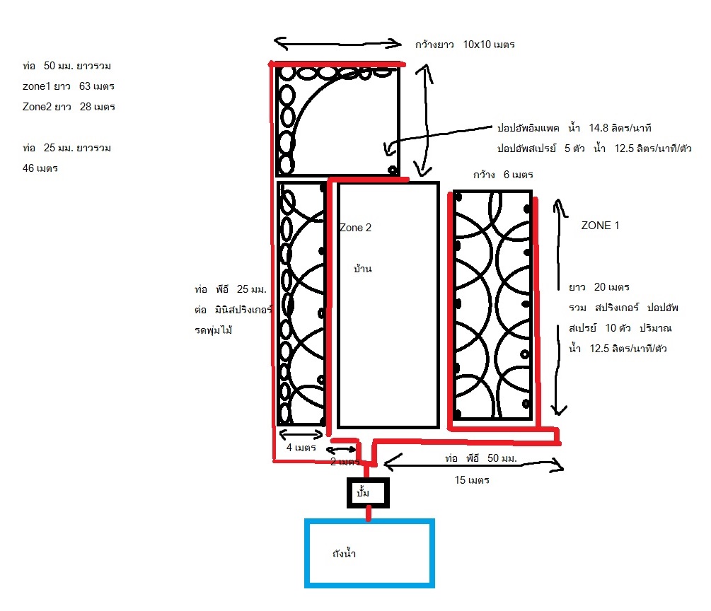 จะใช้ปั๊มน้ำร่วมกันกับตัวบ้าน เพื่อตั้งเวลารดน้ำอัติโนมัติ ตัวบ้านมี ห้องน้ำ 1 ห้อง ครัว 1 ครัว เครื่องซักผ้า 1 เครื่อง สวนมี มี Timer Controller แบ่งได้ 4 Zone อยู่แล้ว และใช้สาย PE 6หุน มีอยู่แล้ว