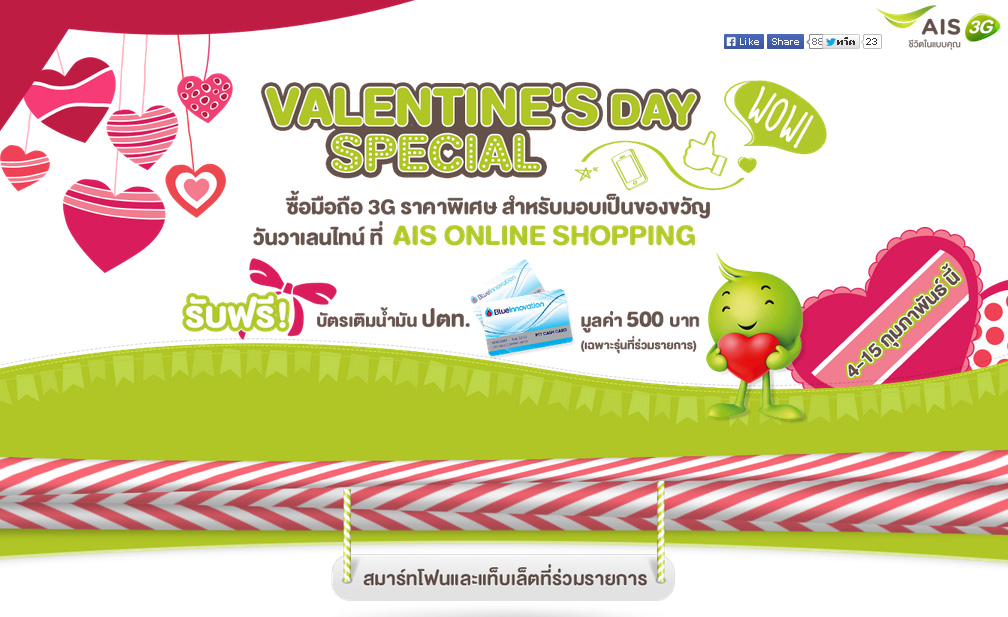 AIS มอบความรักต้อนรับวาเลนไทน์ เติมความหวานให้ท่านสามารถซื้อมือถือ 3Gในราคาสุดพิเศษ รับฟรีบัตรเติมน้ำมันปตท. มูลค่า 500บ เพิ่มเติม http://www.ais.co.th/valentinesale/
