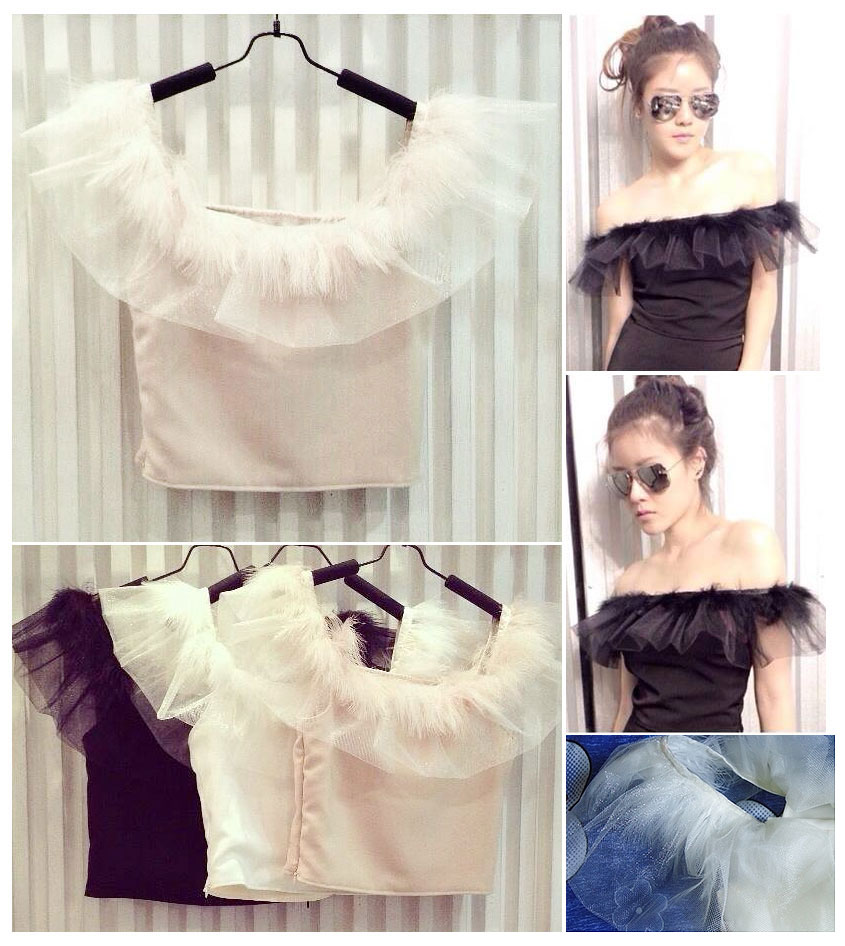 new เสื้อเปิดไหล่ระบายผ้าแก้วแต่งขนนก มีสีขาว สไตล์ la boutique (ซื้อใน fb มา 520-) อก 34 ยาว 13 นิ้ว