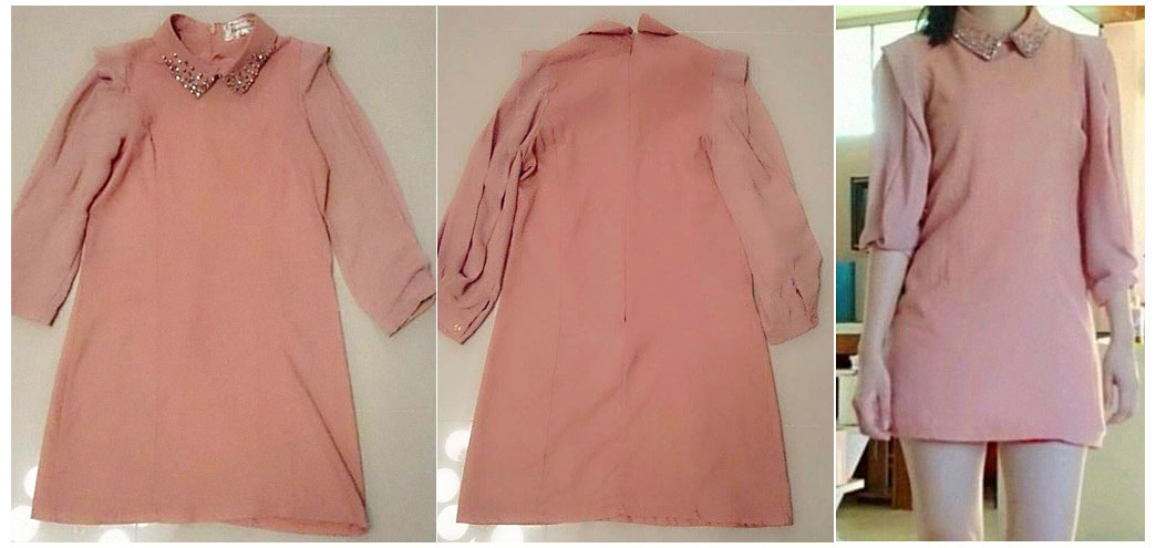 เดรสคอปกปักหมุดทอง สีพีชโอโรสๆ ทรงคุณหนูใส่แล้วดูดีค่ะ ผ้าไม่บาง งานเนี๊ยบ อก 36 เอว 30 สะโพกฟรี ยาว 31 นิ้ว