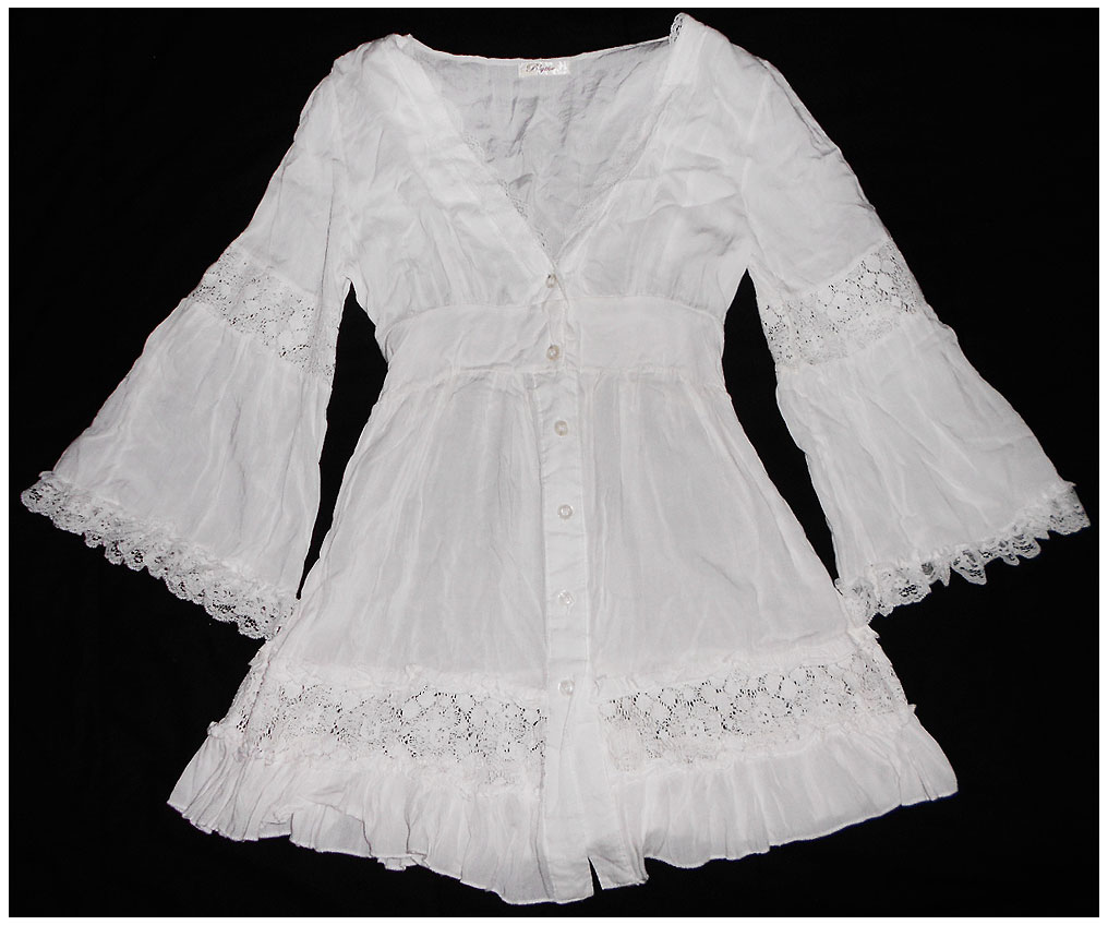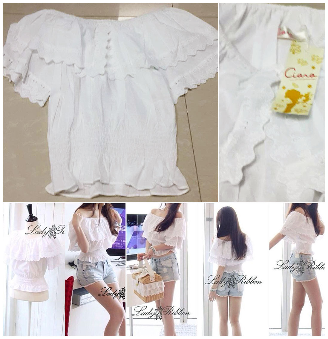 เสื้อเปิดไหล่สีขาวผ้าฉลุ ระบายรอบตัว จั๊มเอว ของใหม่ป้ายห้อย (ซื้อมา 450-) อก 32-38 เอว 24-32 ยาว 21 นิ้ว
