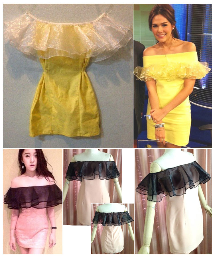 new เดรสสีเหลืองเปิดไหล่ผ้าไฮทวิส ระบายผ้าแก้ว 2 ชั้น อก 32-34 เอว 26-28 สะโพก 34-36 ยาวประมาณ 25 นิ้ว (ซื้อ 590-)