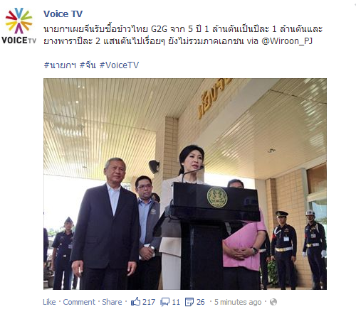 ทีนิวส์รายงานข่าวว่า.. การที่จีนจะซื้อข้าวล้านตัน ยางพาราสองแสนตันต่อปี จะเป็นผลเสียต่อวงการข้าวและวงการยางพารา ทำให้ราคาตกและประชาชนจะเดือดร้อน พวกนี้เขาคิดได้ยังไง พอขายไม่ได้ก็ด่า ขายได้ก็ไม่ดี สงส