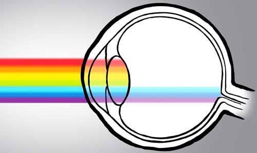 ดังนั้นเวลาเราฉายแสงสีน้ำเงินไปในความมืดและพยายามจะเพ่งดูให้ชัดภาพจะรู้สึกว่าภาพไม่ค่อยชัดเจน