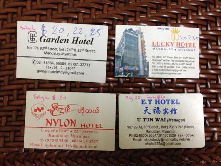เดินไปถามทางไปได้ความว่า รร Nylon นั้นอยู่แถวถนน 25st. ซึ่งก็ไม่ไกลเท่าไหร่ แต่ระหว่างทางก็พบกับคู่รักเกาหลีที่เคยเจอตอนนั่งรถรับส่ง ย่างกุ้ง-บขส มาด้วยกันเมื่อคืนนี้เลยถือวิสาสะถามว่า ขอโทษนะคะ เธอสองคนกำลังจะไปพักกันที่ไหนรึ? เพราะชั้นมิได้จองมาเลย ได้ความว่าพวกนางก็มิได้จองแต่กำลังจะไปถาม ET hotel เราเลยถือโอกาสนี้ขอตามไปด้วย (เพราะดูมา อีที ก็เป็นอีกหนึ่งใน hit lists เหมือนกัน) พอไปถึงก็ถามหาห้องว่าง และราคา พอรู้ว่ามีห้อง single with private bathroom บวกกับราคาที่โอเค คือ $25 ก็เลยตกลงเลย เพราะขี้เกียจเดินหาแล้วเสียเวลาเที่ยวเราด้วย ถึงที่อื่นถูกกว่าก็คงราคาไม่หนีกันมาก พอ check-in ได้ก็เข้าห้องทันทีเพื่ออาบน้ำอาบท่าเปลี่ยนอาภรณ์เสียใหม่