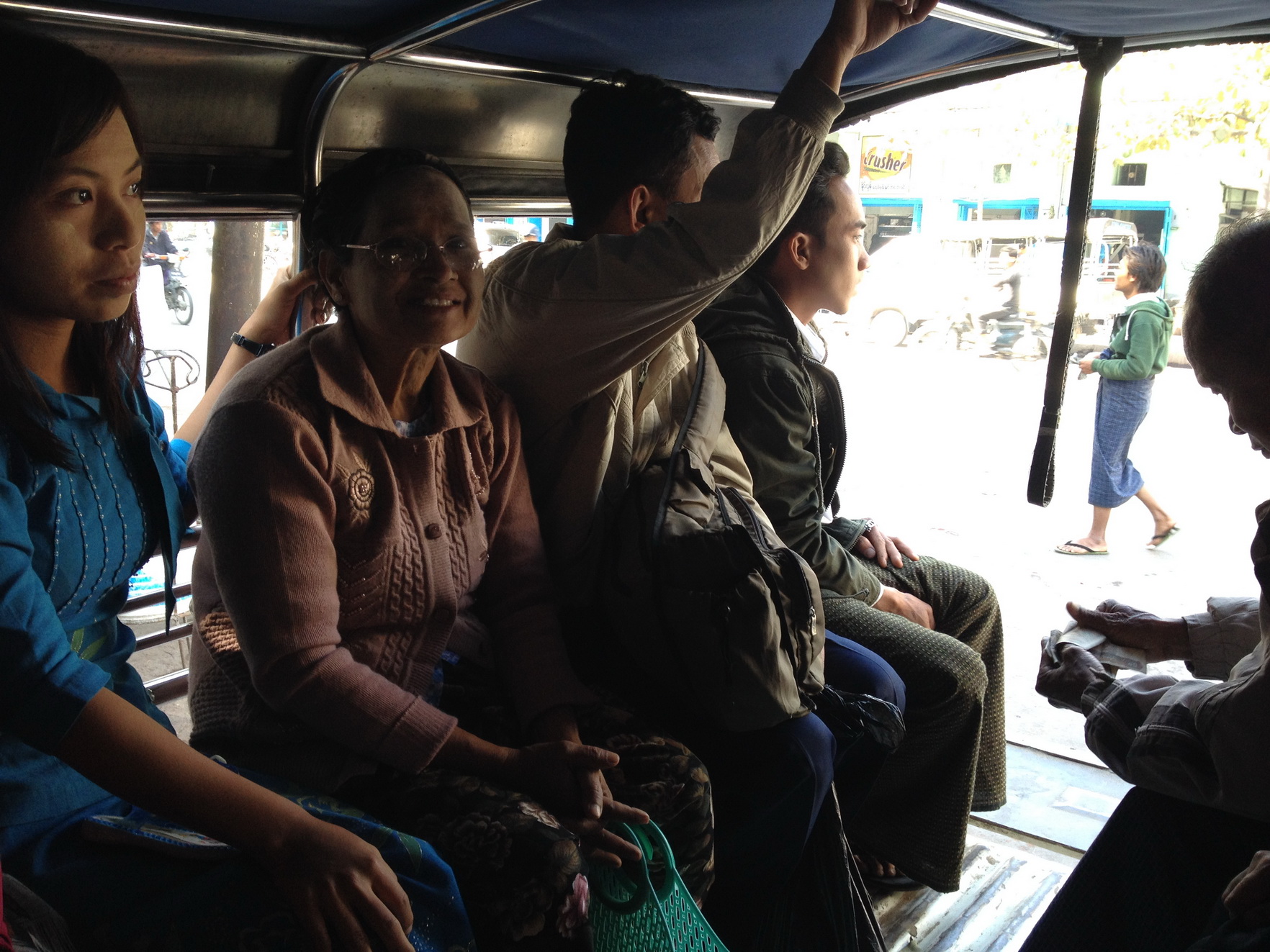 พอเสร็จสรรพก็ย่างกายออกมาเดินสวยสะกดวิญญาณ แบบยังไม่แน่ใจที่หมายดี ยอมรับตามตรงเลยว่าทริปนี้แทบไม่ได้แพลนมาเลย ...random สุดๆ!! เดินไปไม่ไกลก็เจอร้านผ้าซิ่น (longyi) มันช่างยวนใจเสียนี่กะไรเลยแวะซักหน่อย ดูไว้ก่อนกะไปดูที่ตลาดก่อนแล้วค่อยเทียบกัน ดูเสร็จก็เดินต่อ กะว่าจะไปตลาดแล้วหารถไปสะกาย แต่พอเดินผ่านแถวถนน 25st+83rd. ก็มีพ่อหนุ่มสองแถวนายหนึ่งเข้ามาเสนอสิ่งดีๆ โดยถามว่าจะไปไหน รถกระป๊อฮีไป Mandalay hill นะจ๊ะ ไปมะๆ? ได้ยินอย่างนั้นเราก็ฉุกคิดแล้วก็เหมือนโดนสะกดจิตให้ขึ้นรถไปทันใด ซึ่งค่ารถนี่คิดเราไป 500k ซึ่งจริงๆเราคิดว่ามัน 200k นะ แต่ก็เอาเถอะพอรับได้...