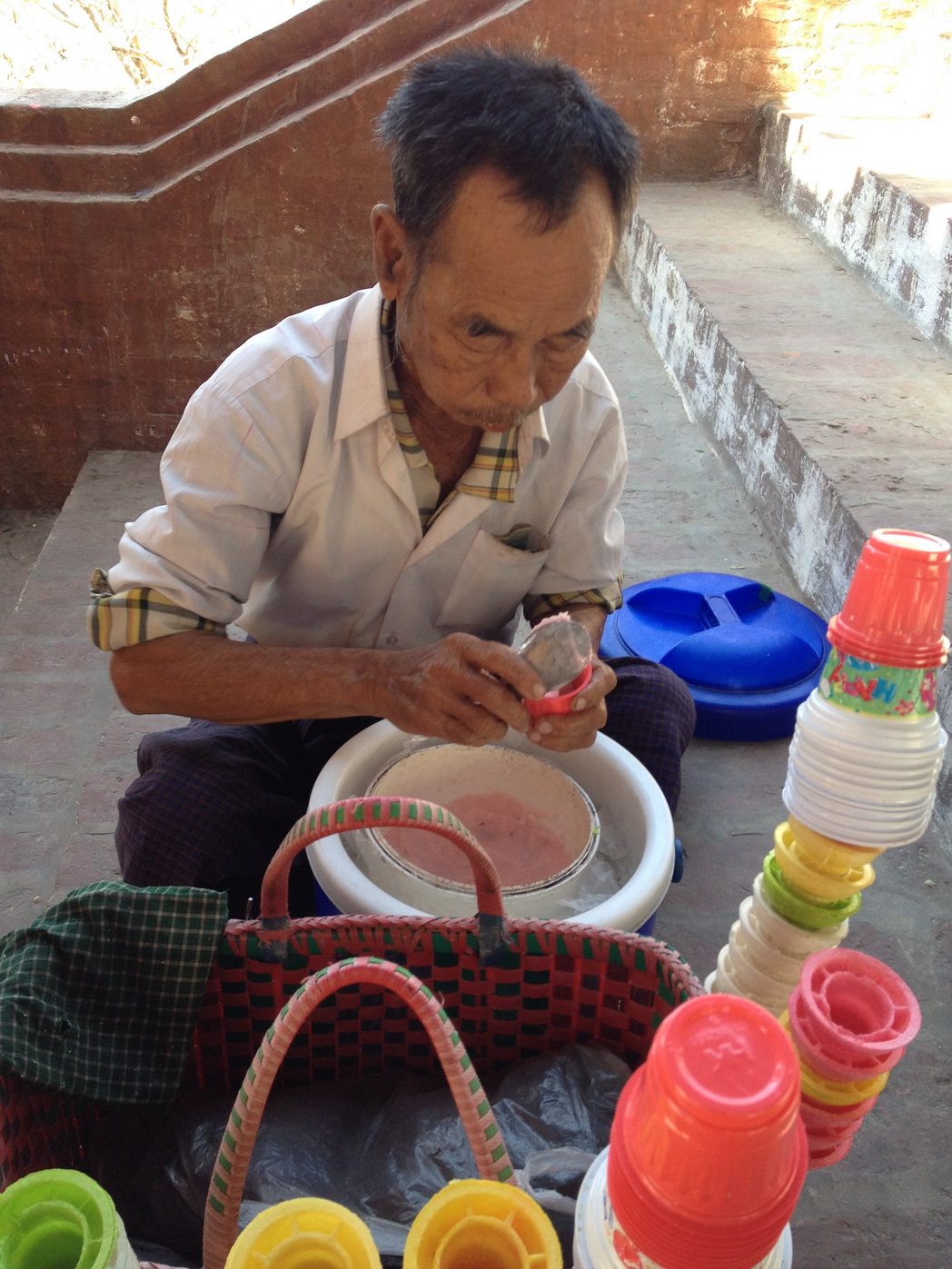 หลังจากอิ่มเอมกับวิวทิวทัดเมืองมัณฑะเลย์บนยอดเขามัณฑะเลย์ฮิลล์เรียบร้อยแล้วก็เดินลัดเลาะลงมา ระหว่างทางเจอคุณลุงขายไอติมกระติก น่ารักดีเลยขอลองซะหน่อย ไอติมถ้วยจิ๋วนี้ราคา 300k เท่านั้น เป็นไอติมสตรอวเบอร์รี รสชาติออกหวานๆติดเค็มเล็กน้อย55 แต่ก็อร่อยดี