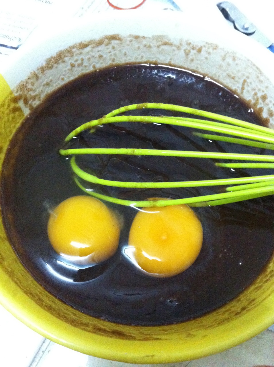 3. พอเข้ากันแล้วก็ใส่ไข่ลงไปเลยค่ะ แล้วก็ตีผสมจนเข้ากันเหมือนเดิม