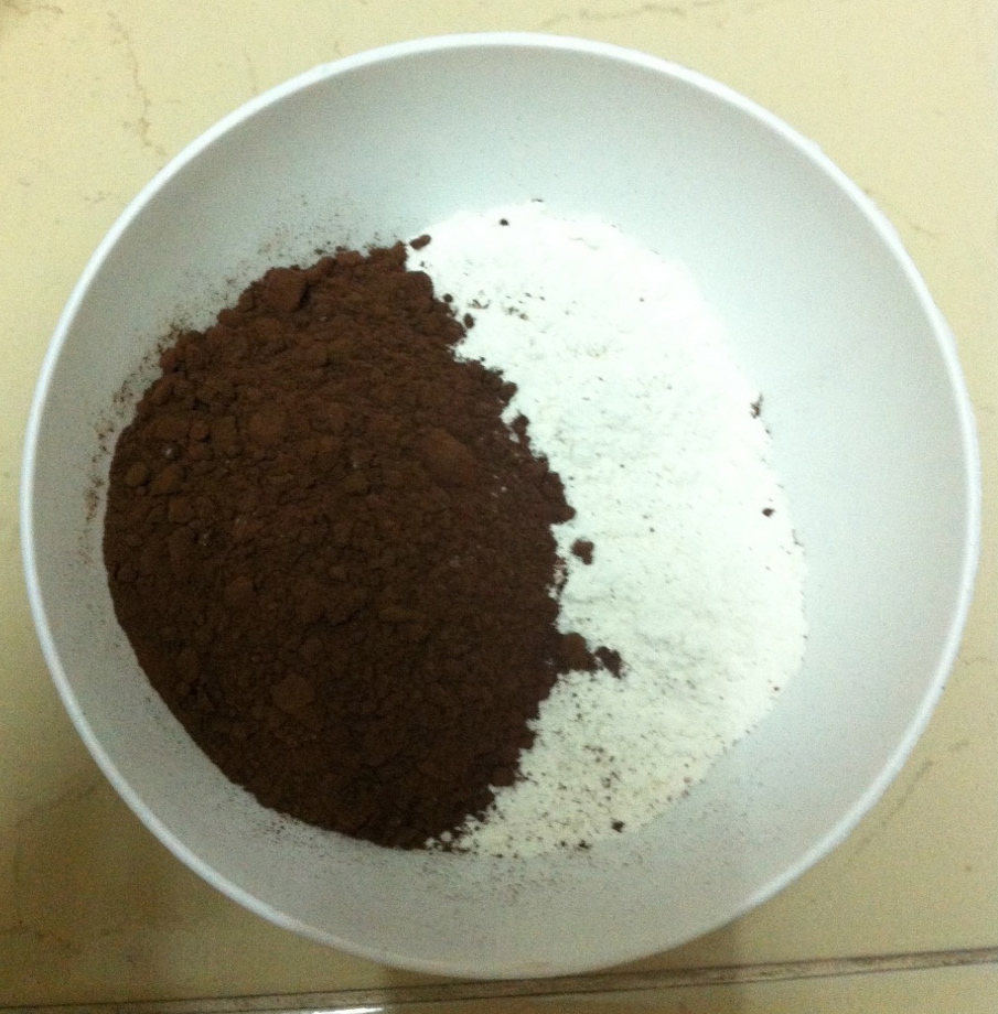 4. ใส่แป้งและผงโกโก้ลงไปค่ะ อันนี้ตามกระทู้ข้างบนบอกให้ตีแรง ๆ และเร็ว ๆ เราก็ทำตามเลยค่ะ ผสมจนกว่าจะรู้สึกว่าส่วนผสมเงา
