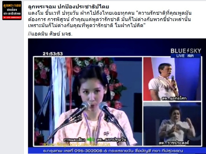 พ่อแม่พี่น้องครับ มาร่วมกันแสดงพลังร่วมให้กำลังใจพี่น้องมวลมหาประชาชน อย่าให้ชาติไทยพังพินาศด้วยระบอบทรราชทักษิณที่มันบ่อนทำลายชาติของเราอีกต่อไป แล้วขอประนามการกระทำของรัฐบาลและพนักงานตำรวจที่ได้ใช