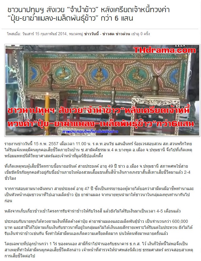 ชาวนาปทุมธานีผูกคอตายในบ้าน คาด เครียดไม่มีเงินจ่ายหนี้ค่าปุ๋ยกว่า 6 แสนบาท เหตุยังไม่ได้เงินจำนำข้าว วันนี้ (15 กุมภาพันธ์ 2557) เจ้าหน้าที่ตำรวจ สภ.สวนพริกไทย จ.ปทุมธานี ได้แจ้งเหตุมีคนผูกคอตายใน