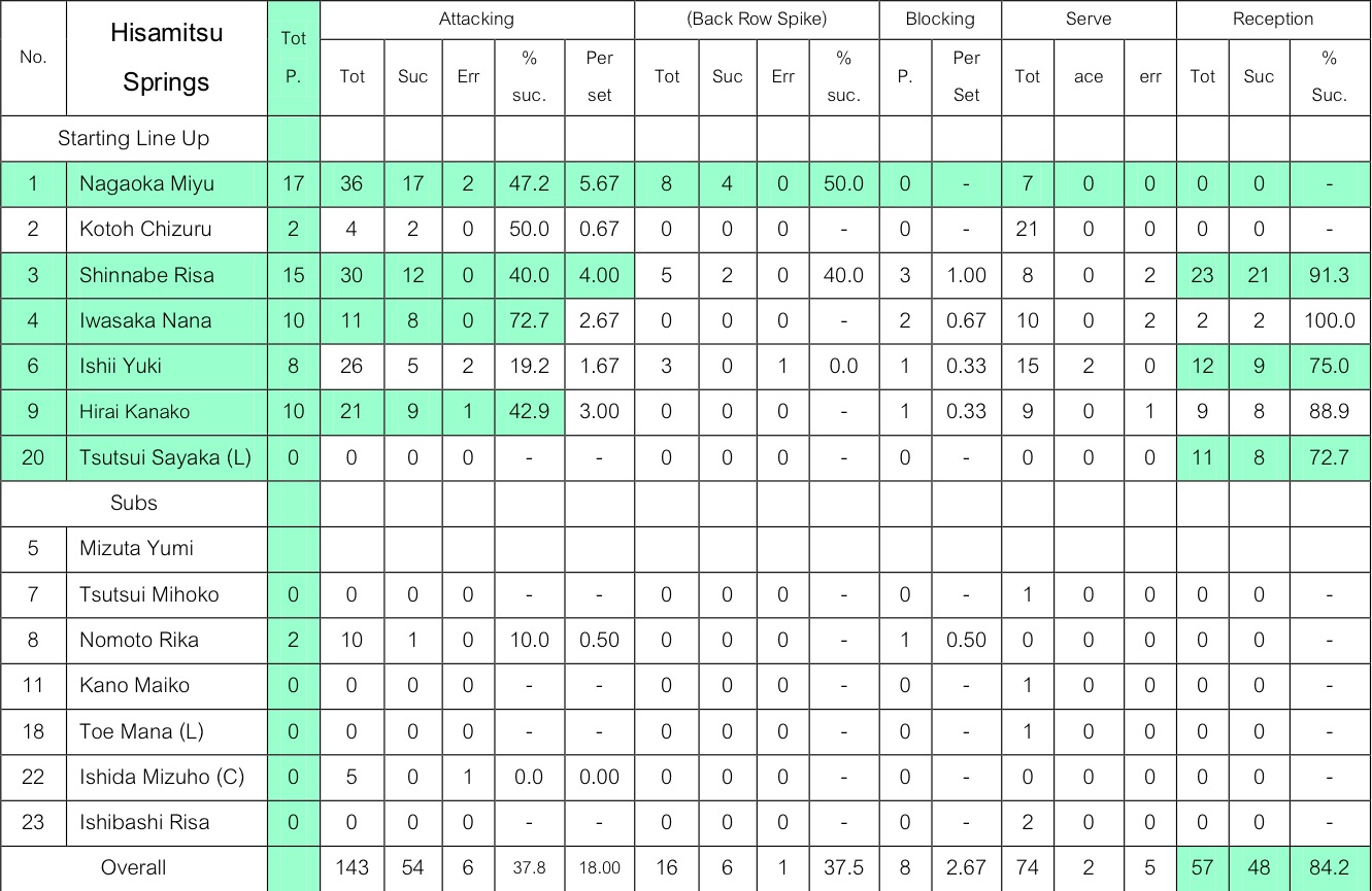 Hisamitsu Springs v. Hitachi Rivale : 3 - 0 (33-31, 25-20, 25-15) (http://www.vleague.or.jp/direct/vleague_dataroom/printb/id=22256) จริงๆเหมือนวันนี้ Springs ไม่ได้ท๊อปฟอร์มอะไรเลยนะคะ นอกจาก Na