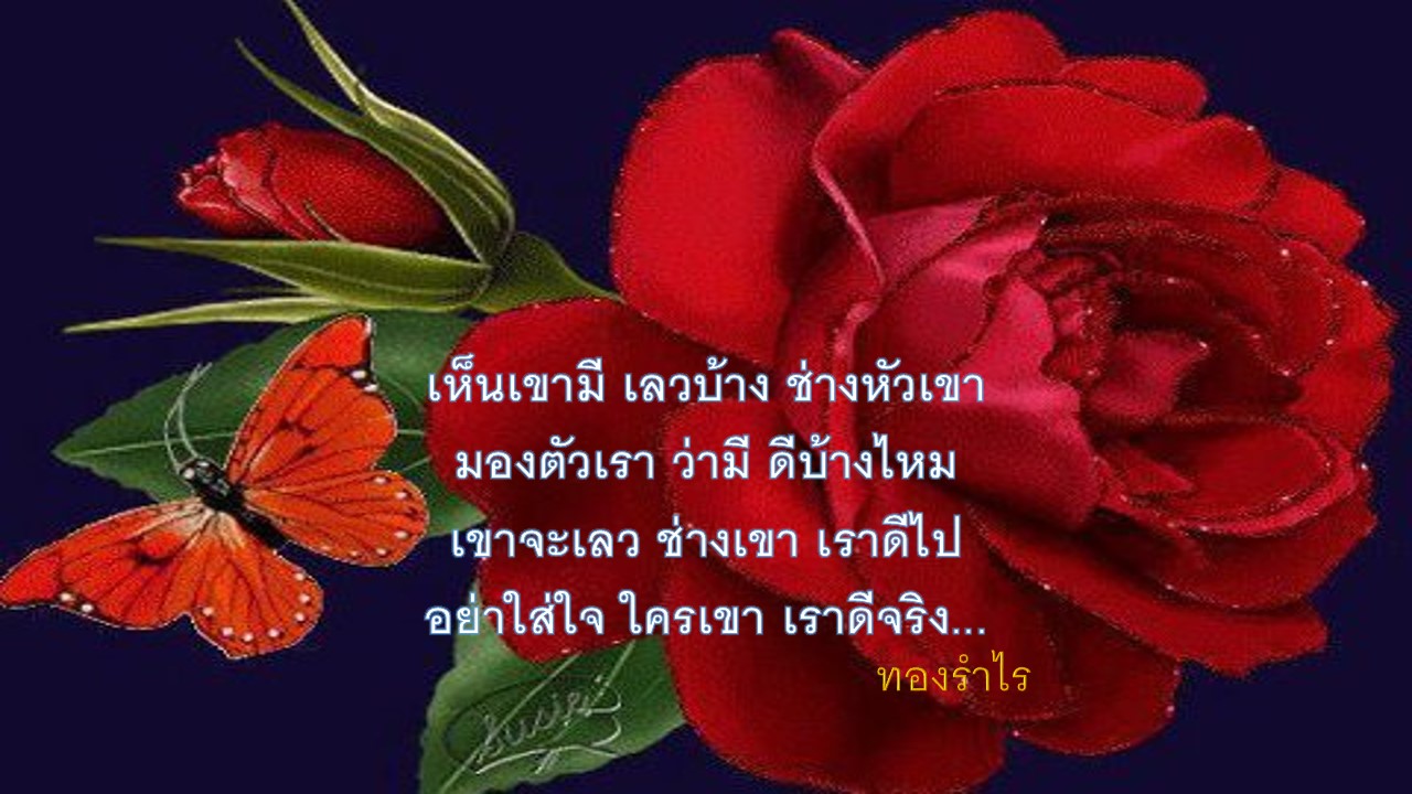 คอยจ้องจับ นับเนื่อง เรื่องคนอื่น จับผิดฝืน ฝักใฝ่ ใครอื่นเขา คนอื่นนั้น มั่นดู อยู่นานเนาว์ เขาหรือเรา เท่ากัน นั้นชั่วดี กลับมาดู อยู่กับตัว อย่ามัวหลง ตัวเราจง จดจำ ทำสุขขี ก่อนจะคอย ว่าเขา ไม่เข้