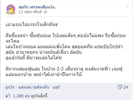 คุณเจี๊ยบ สมรัก พรรคเพื่อเก้ง เขาฟันธงมาแล้วว่าคืนนี้ ลิเวอร์พูล มาใสๆ