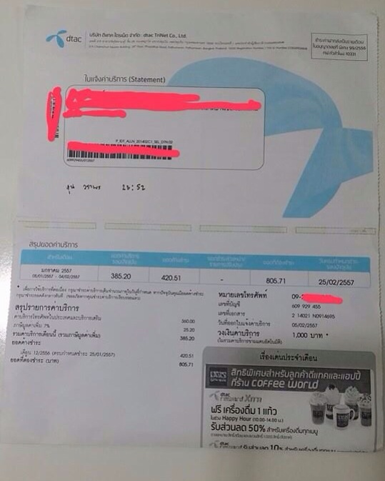 -และแล้วค่าบริการเดือนแรกก็ส่งมา 420.51 ( ผมสมัคร โปร 350 ซึ่งหลังจากหักส่วนลด เดือนละ 300 ตามโปร ควรจะเหลือ 120 โดยประมาณ) แต่ก็ยังไม่ชำระเพราะ Dtac อาจจะผิดพลาดรอ เดือนต่อไปดีกว่าและได้ทำการแจ้งไปที่ ศูนย์บริการทางศูนย์บอกให้รอดูเดือนต่อไป