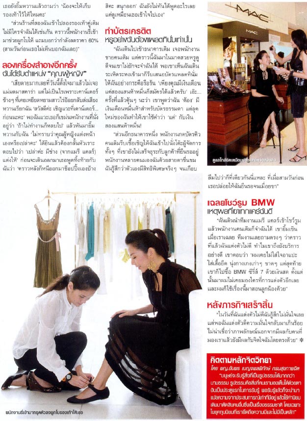 เนื้อเรื่องย่อๆ ก็คือสาวน้อยคนนี้แกล้งแต่งตัวโกโรโกโส ไปซื้อของในห้างหรู ทำบัตรเครดิตแพลทตินั่ม ซื้อรถบีเอ็มซีรี๋ส์ 7 ปรากฎว่าทุกแห่ง ดูหมิ่นเหยียดหยามในความเป็นคนของเธออย่างสมบูรณ์แบบ ไม่มีพนักงานสนใจ มองด้วยสายตาหยามเหยียด บางคนทำจมูกเหมือนเหม็นกลิ่นสาบแห่งความเป็นคนของเธออย่างหยาบคาย ตอบคำถามเหมือนไม่อยากตอบ ไม่มีการต้อนรับเชื้อเชิญใดๆ ยกเว้นเซลล์หนุ่มขายรถบีเอ็มราคาเหยียบ 10 ล้านเท่านั้นที่ดูแลเธอเสมือนเป็นลูกค้าคนหนึ่ง หากแต่...อีก 2-3 วันหลังจากนั้น สาวน้อยคนเดิม ณ ร้านค้าร้านเดิม ธนาคารเดิม ศูนย์ขายรถเดิม แต่ "แต่งตัวไม่เหมือนเดิม" สวย เฉียบ มวยผมอย่างดี ถือของแบรนด์เนม ปรากฎว่า...การต้อนรับราวฟ้ากับเหว ร้านกระเป๋าเดิมสอบถามด้วยความนอบน้อม ร้านรองเท้าพนักงานที่ทำท่าเหม็นเหยียดหยาม ก้มลงผูกเชือกรองเท้าให้ด้วยความเคารพ ธนาคารที่ทำบัตรเครดิตเชื้อเชิญให้นั่งรอที่โต๊ะผู้จัดการ ส่วนเซลล์รถยนต์ก็ยังดูแลเธอเหมือนเดิมไม่ต่างจากวันที่แต่งตัวโกโรโกโสมาหาเค้าในวันนั้น