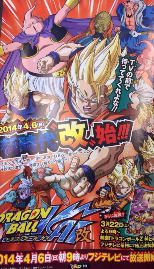V Jump magazine ฉบับที่ 4/2014 ได้ประกาศอย่างเป็นทางการว่า อนิเมทีวีเรื่อง Dragon Ball Kai จะกลับมาฉายภาค "New age of Kai" (ภาคจอมมารบู) ในวันที่ 6 เมษายนนี้ ในช่วงเวลาวันอาทิตย์ 9 โมงเช้า (ซึ่งเจ้าของเดิมเป็นของ Toriko นั่นเอง) โดยก่อนหน้านั้น ในวันที่ 22 มีนาคม จะฉาย Dragonball Z Movie Battle of Gods อีกด้วย