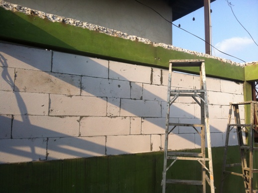 ตอนแรกเขาพูดเหมือนจะใช้อิฐมวลเบา แต่แล้วกลับใช้อิฐบล็อก เป็นผนังด้านบนของทับหลังหน้าต่าง ก่อไปจนชนเหล็กโครงสร้างหลังคา ผนังด้านล่างและข้างหน้าต่างก่ออิฐมอญ ก่อโดยผู้รับเหมาอีกเจ้า ที่ทำไม่เสร็จแล้วทิ้
