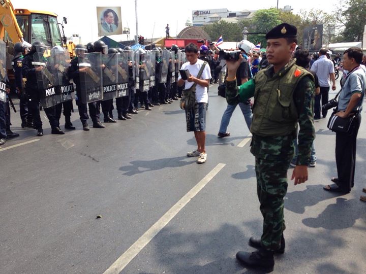 ภาพเหตุการณ์ขณะเจ้าหน้าที่ตำรวจซึ่งปฏิบัติหน้าที่บริเวณบริเวณสะพานผ่านฟ้า และมีการตั้งแต่แถวโดยใช้โล่กำบัง และมีเจ้าหน้าที่ตำรวจนายหนึ่งกวักมือเรียกให้เจ้าหน้าที่ตำรวจอีกนายหนึ่งมาตั้งโล่กำบังเสริม ใน