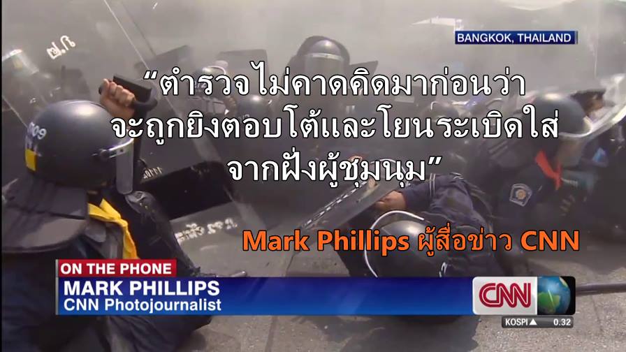 18 ก.พ. 57 Mark Phillips จาก CNN ที่อยู่หลังแนวตำรวจบริเวณอนุสาวรีย์ประชาธิปไตยบอกว่า ช่วงแรกที่ผู้ประท้วงยิงปืนและโยนระเบิดตอบโต้ใส่ตำรวจ ๆ ก็คาดไม่ถึง ตำรวจหลายคนล้มลงและบาดเจ็บ มีการยิงตอบโต้มาอย่างต่อเนื่องจากฝั่งผู้ชุมนุม จนตำรวจต้องล่าถอยไป ส่วนผู้ชุมนุมเดินหน้าเข้ามา