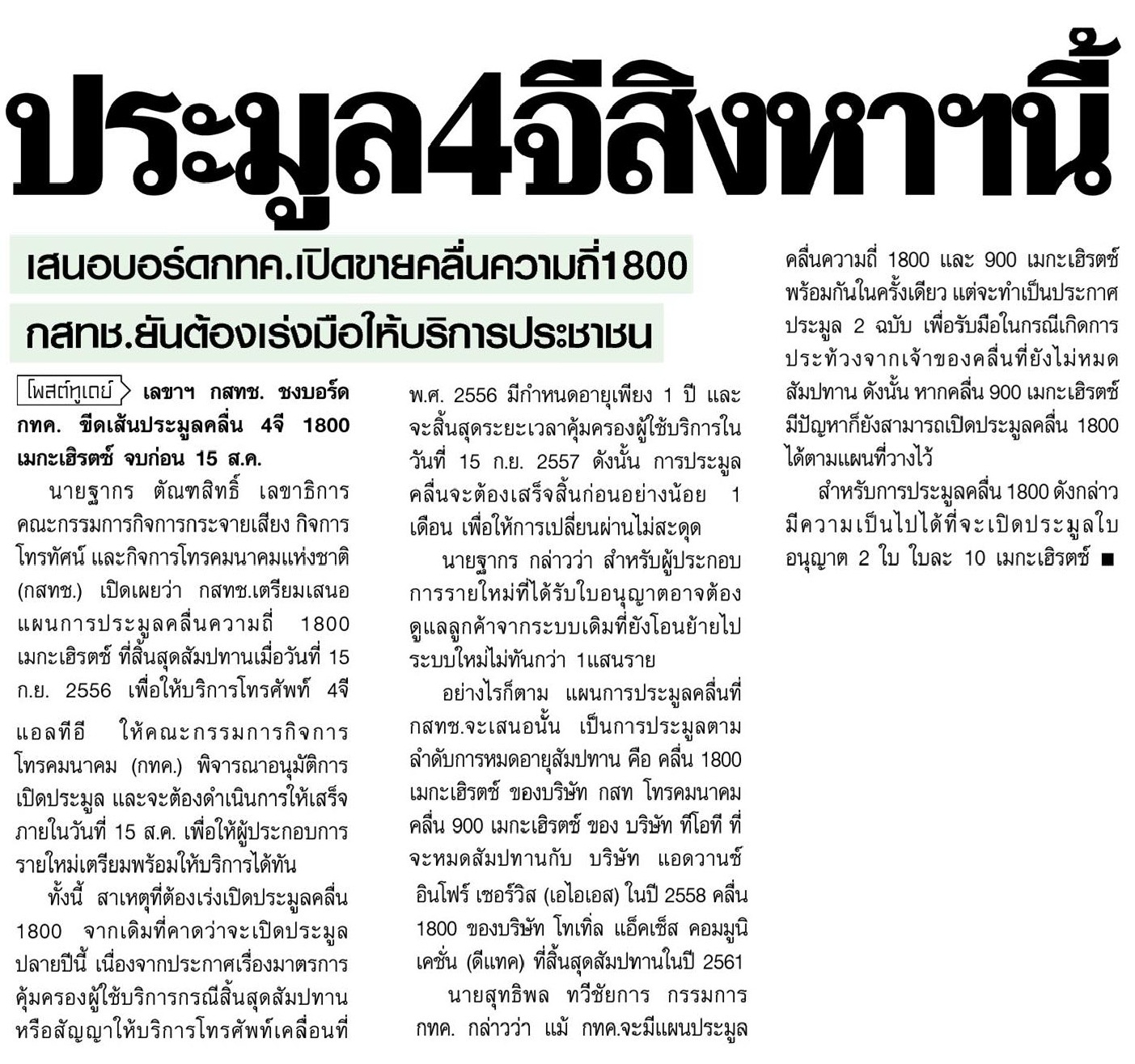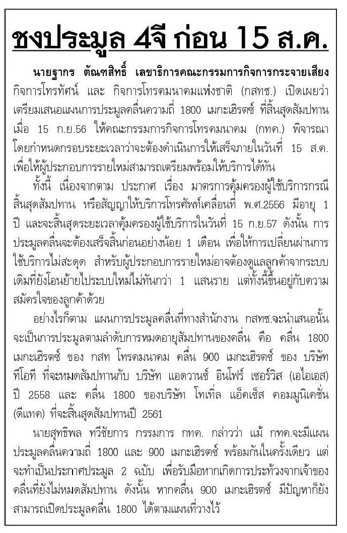 "ประยุทธ์" สั่งเลื่อนประมูล 4 จี กสทช.ลนลานฟันธง 15 ธ.ค.เปิดเคาะราคา ไทยรัฐ ฉบับวันที่ 3 พฤศจิกายน พ.ศ. 2558 นายกฯสั่งเลื่อนประมูล 4 จี คลื่น 900 บอร์ด กทค.เด้งรับเรียกประชุมด่วน เลือก 15
