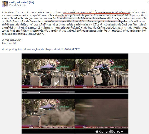 พลันที่ นายเอกนัฏ พร้อมพันธุ์ โฆษก กปปส. ออกมายอมรับในความผิดพลาด ในการจัดทำ "สคริปต์" เรื่องระเบิดให้ นายสุเทพ เทือกสุบรรณ พูดบนเวที ก็ "ชัด" "ผมขออภัยเจ้าหน้าที่ตำรวจท่านน