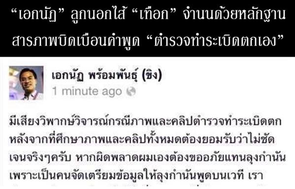 "มีเสียงวิพากษ์วิจารณ์กรณีภาพและคลิปตำรวจทำระเบิดตก หลังจากที่ศึกษาภาพและคลิปทั้งหมดต้องยอมรับว่าไม่ชัดเจนจริงๆครับ หากผิดพลาดผมเองต้องขออภัยแทนลุงกำนันเพราะเป็นคนจัดเตรียมข้อมูลให้ลุงกำนันพูดบนเวที เราต้องการนำเสนอข้อมูลให้เร็วที่สุดเพราะที่ผ่านมาศรส.มีการบิดเบือนข้อมูลตลอดเวลา ผมขออภัยเจ้าหน้าที่ตำรวจท่านนั้นที่ต้องบาดเจ็บจากวีรกรรมที่กล้าหาญ อยากให้ตำรวจทุกคนเป็นเช่นนี้ครับ ในขณะเดียวกันต้องขอประนามการสั่งการของศรส.ที่ให้เจ้าหน้าที่ใช้กำลังและอาวุธทำร้ายประชาชนบริสุทธิ์อย่างโหดเหี้ยม จนทำให้ผู้ชุมนุมต้องได้รับบาดเจ็บและเสียชีวิตอย่างน้อย 3 คน ผมไม่อยากให้คนชั่วนำกรณีนี้ไปสร้างเป็นประเด็นเพื่อบิดเบือนหลักฐานอื่นๆที่แสดงให้เห็นว่าเจ้าหน้าที่ของศรส.ใช้กำลังเกินกว่าเหตุต่อผู้ชุมนุมที่บริสุทธิ์ ผมคิดว่าเราต้องรับผิดชอบต่อข้อมูลและความคิดเห็นที่นำเสนอ เราจะสู้ด้วยข้อมูลที่เป็นความจริงเท่านั้นครับ และหวังว่าผู้ใหญ่ในบ้านเมืองทั้งหลายจะทำเช่นเดียวกัน นำเสนอข้อเท็จจริงและมีความกล้าที่จะรับผิดชอบต่อข้อมูลที่เรานำเสนอครับ"